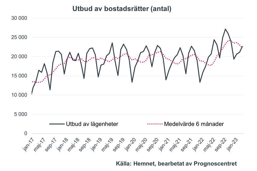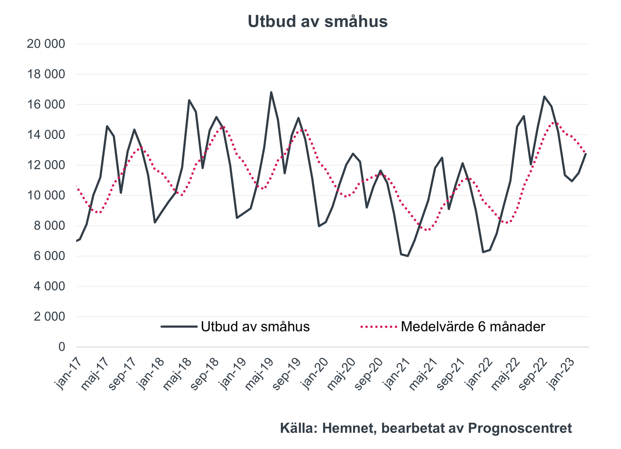 Även småhusutbudet gick upp, med 11 procent jämfört med månaden innan och med 37 procent jämfört med samma månad 2022. Totalt uppgick utbudet till drygt 12 700.