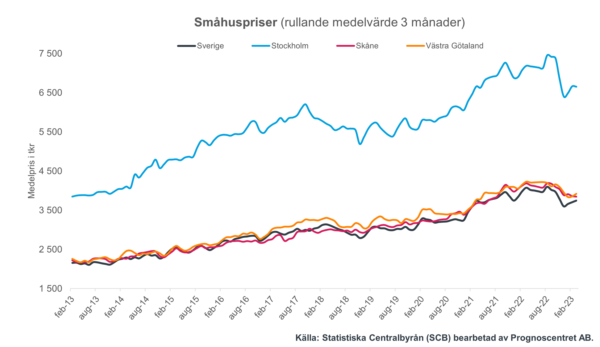 I Stockholm ökade priserna med 1,1 procent jämfört med februari men har minskat med 9 procent över en 12-månadersperiod. I Västra Götaland var ökningen 1 procent på månadsbasis men minskade med 12,4 över 12 månader.