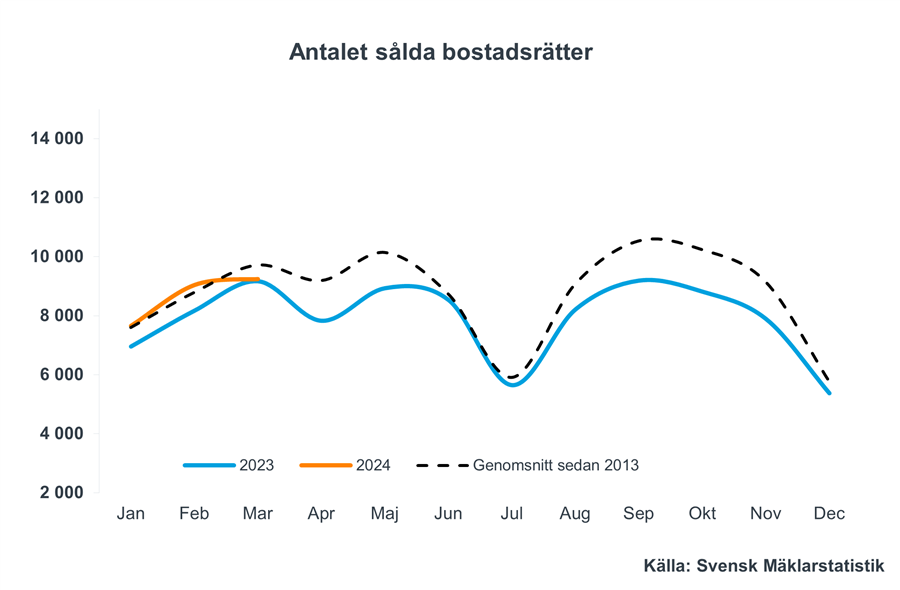 I mars uppgick antalet sålda bostadsrätter till 9 200 vilket något lägre än det historiska genomsnittet (9 700) men 2 procent fler än i fjol och 1 procent fler än månaden innan.