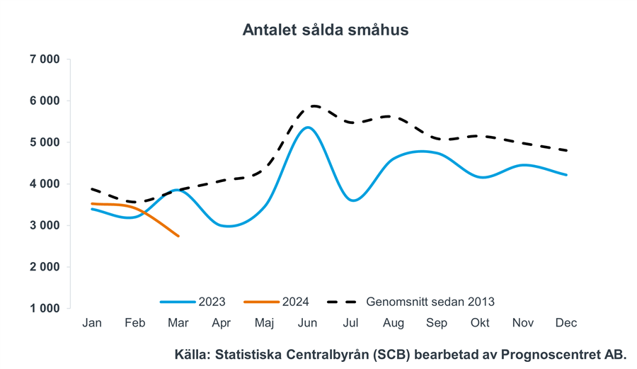 Antalet försäljningar av småhus uppgick i mars till drygt 2 700 vilket är 29 procent lägre än i fjol och 20 procent lägre än februari. Det historiska genomsnittet för månaden ligger på 3 850.