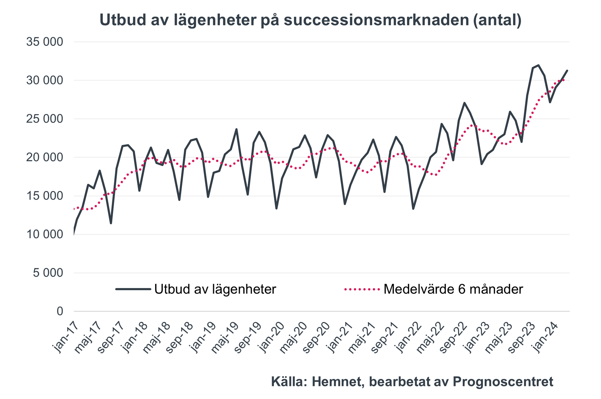 Hemnets statistik för successionsmarknaden avseende mars vilket inkluderar såväl bostäder till salu samt kommande objekt, visar att utbudet av lägenheter i mars uppgick till omkring 31 000, vilket är 39 procent högre än för ett år sedan samt 4 procent högre än månaden innan.