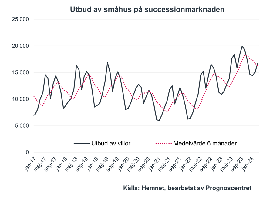 Utbudet av villor på Hemnet uppgick i mars till nästan 17 000 vilket är 32 procent högre än förra året och 12 procent högre än februari.