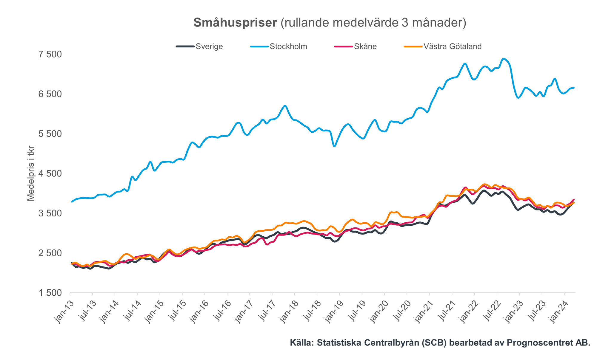 På 12 månader har priserna stigit med 2,4 procent i Stockholms län, 0,1 procent i Skåne län samt 1,8 procent i Västra Götaland.