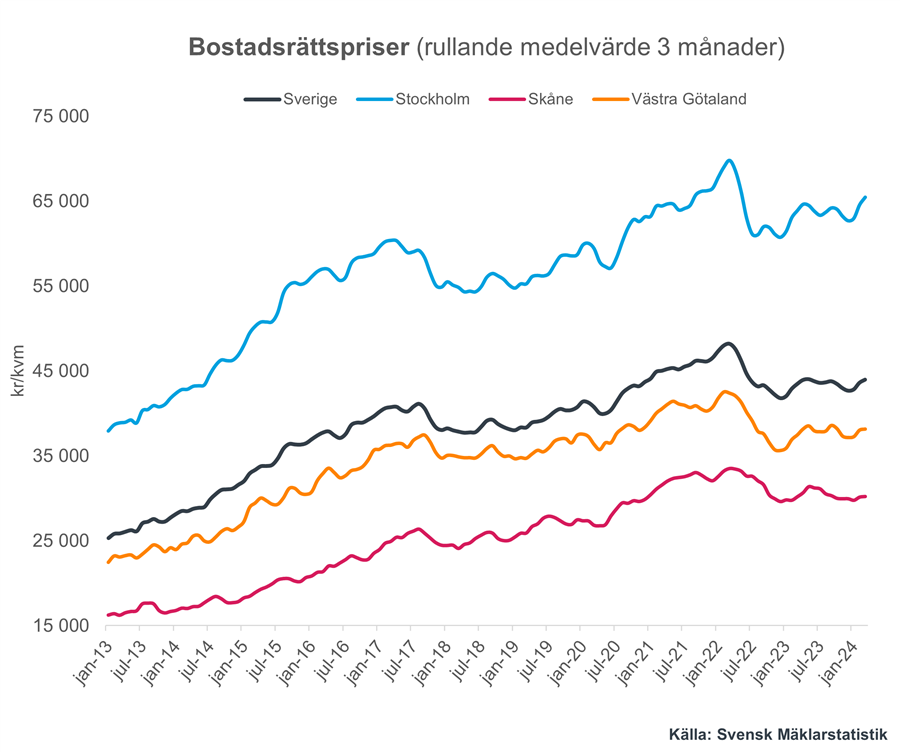 Priserna på bostadsrätter i hela landet steg med 0,8 procent i mars jämfört med månaden innan. På 12 månader har priserna stigit med 1,1 procent.