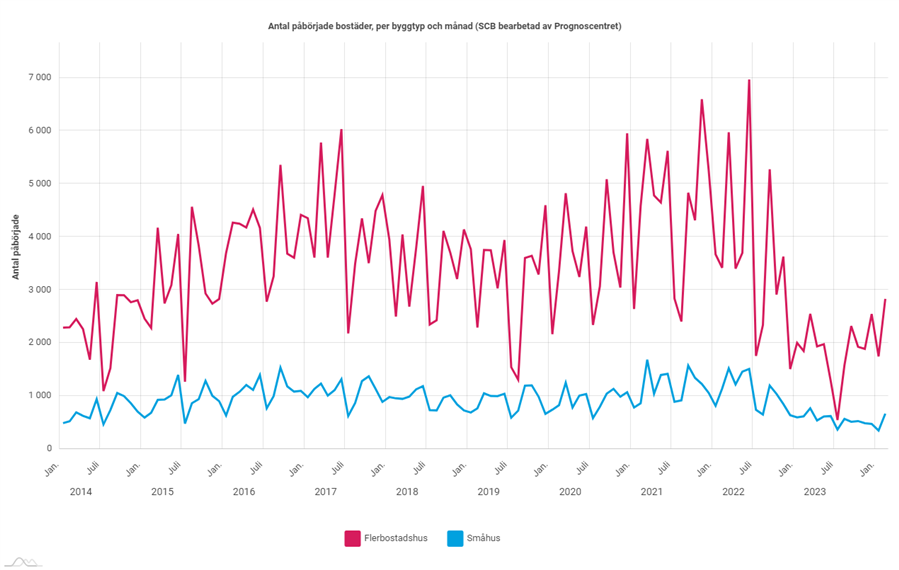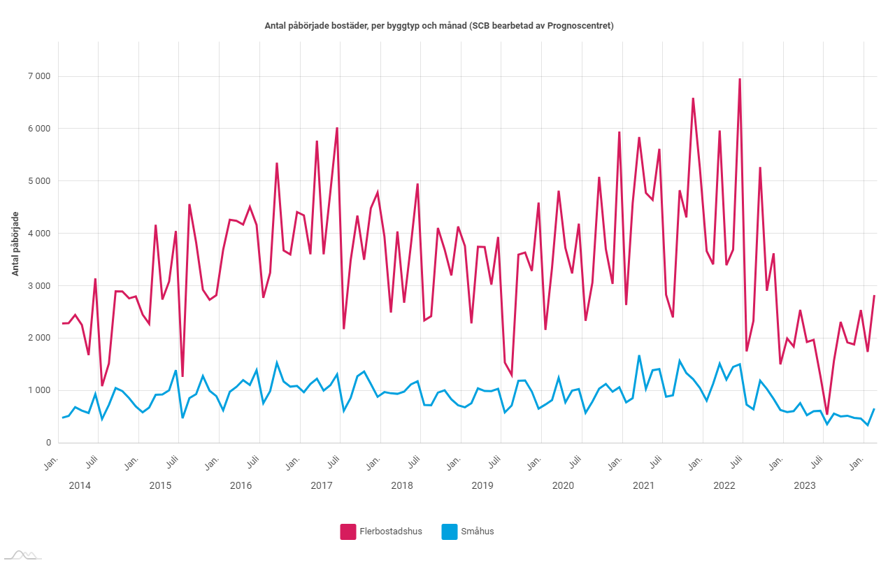 Fördelat på byggtyp så påbörjades omkring 2 800 lägenheter och 670 småhus. Det motsvarar uppgångar om 53 resp. 8 procent jämfört med samma period förra året.