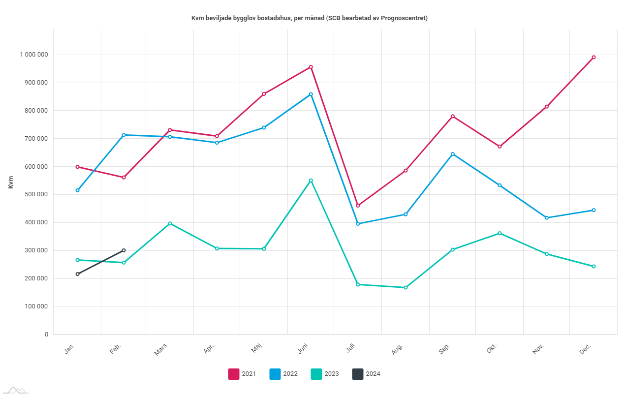 Beviljade bygglov för bostadshus (inkl. fritidshus) uppgick i februari till omkring 301 000 kvadratmeter, vilket är 17 procent eller 44 000 kvadratmeter högre än i februari 2023.