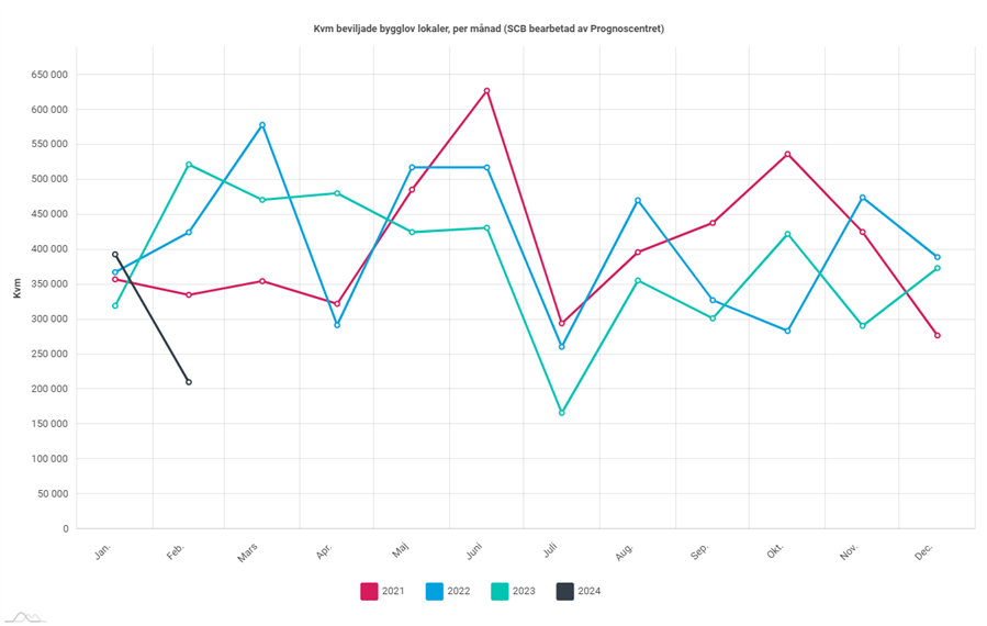 I februari beviljades en areal om totalt 210 000 kvadratmeter lokaler, en minskning med 60 procent eller 312 000 kvadratmeter jämfört med samma period föregående år.