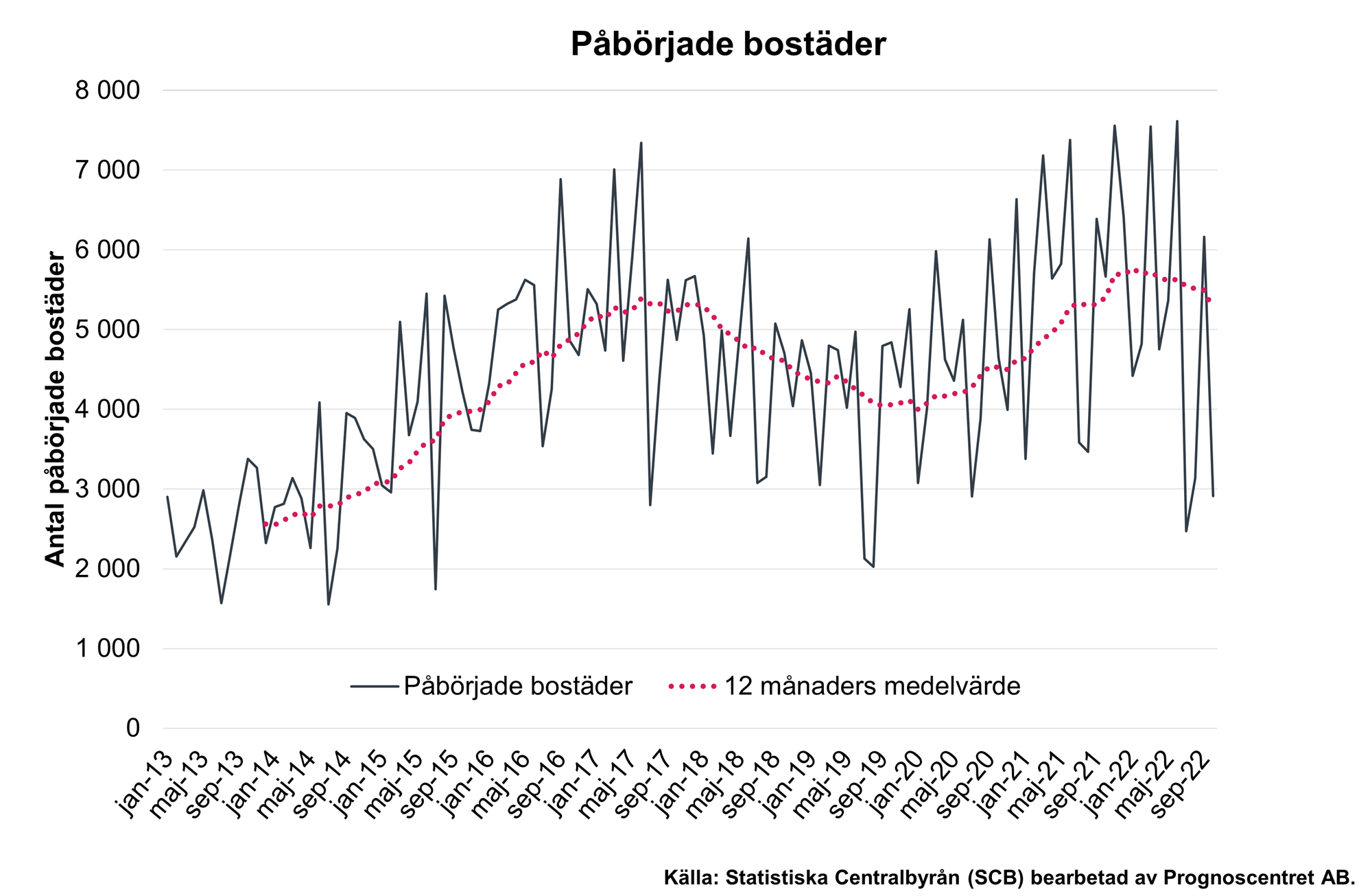 I oktober påbörjades drygt 2 900 bostäder i Sverige vilket nästan är en halvering jämfört med samma månad 2021. Från januari till och med oktober 2022 påbörjades cirka 49 200 bostäder, att jämföra med 54 200 under samma period året innan, vilket motsvarar en nedgång med omkring 9 procent.