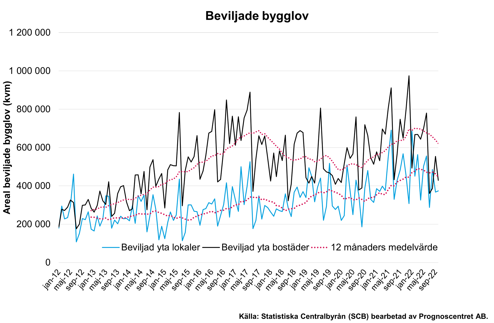 Bortsett från ett starkt första kvartal och en stark augustimånad uppvisade resterande månader under 2022 (fram till och med oktober) negativa tal gällande beviljandet av nya lokaler (i kvm). I oktober beviljades drygt 370 000 kvm nya lokaler, en minskning med 34 procent jämfört med samma månad 2021.
