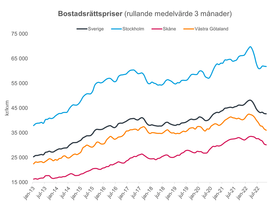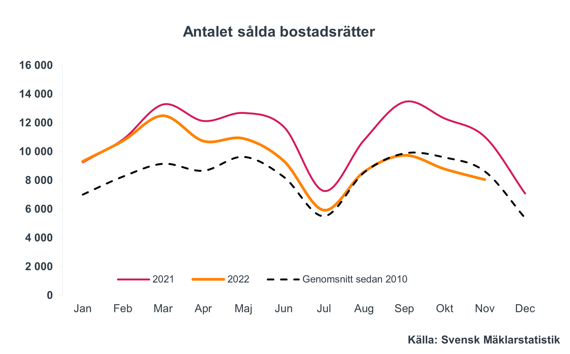 Omsättningsstatistiken från november visar att bostadsrättsförsäljningarna i landet minskade med 8 procent jämfört med i oktober och landade på cirka 8 100. Vid jämförelse med november 2021 var nedgången 27 procent. Under de elva första månaderna 2022, visar tio av dessa på en nedgång jämfört med motsvarande period under 2021, med en genomsnittlig nedgång på 16 procent.