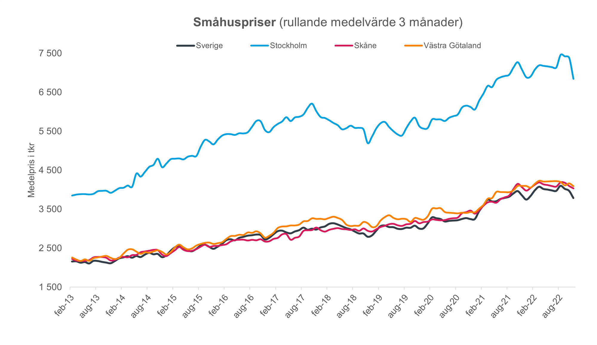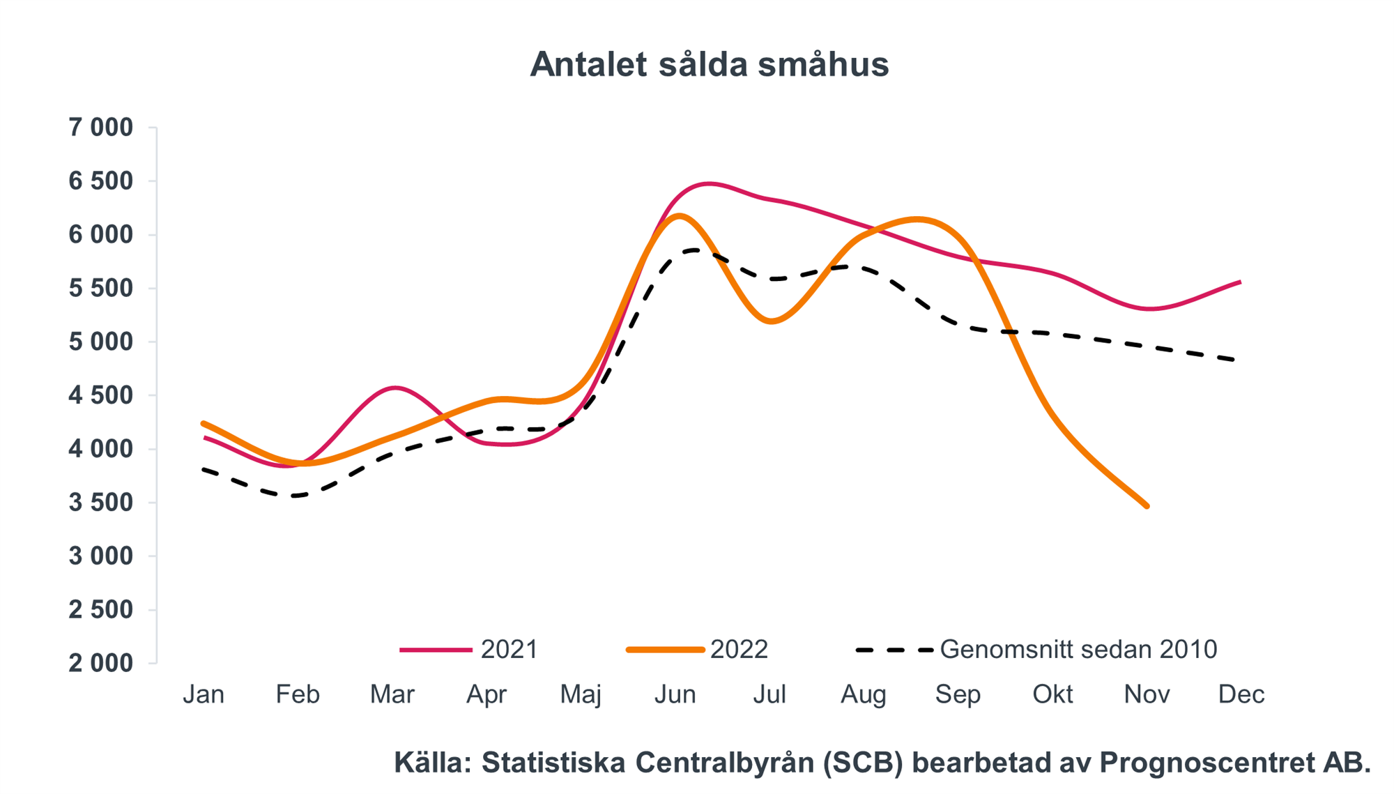 Antalet sålda småhus i november uppgick till cirka 3 500, en minskning med 20 procent jämfört med månaden innan. Jämför vi med samma månad 2021 var nedgången 35 procent. I tidsserien från 2001 till och med 2022, så är antalet under november 2022 det lägsta för november månad.
