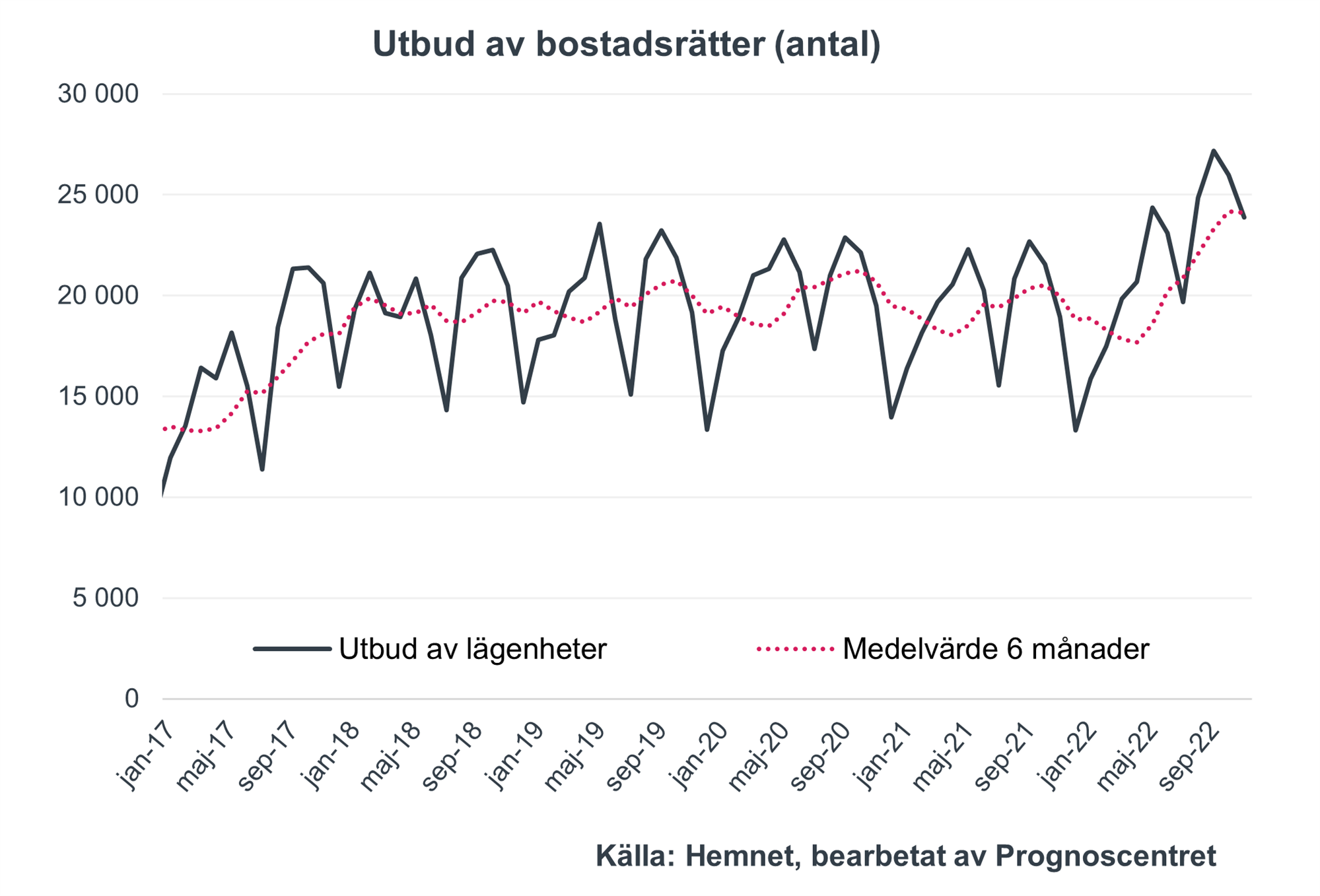 Utbudet av lägenheter på Hemnet uppgick i november till nästan 24 000, en ökning med 26 procent jämfört med samma månad 2021, men en minskning med 8 procent jämfört med oktober 2022.