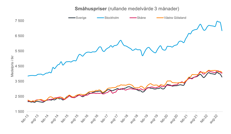 För perioden som uppmättes i november minskade småhuspriserna i landet med 4,6 procent jämfört med perioden innan, och minskade med 2 procent jämfört med motsvarande period 2021.