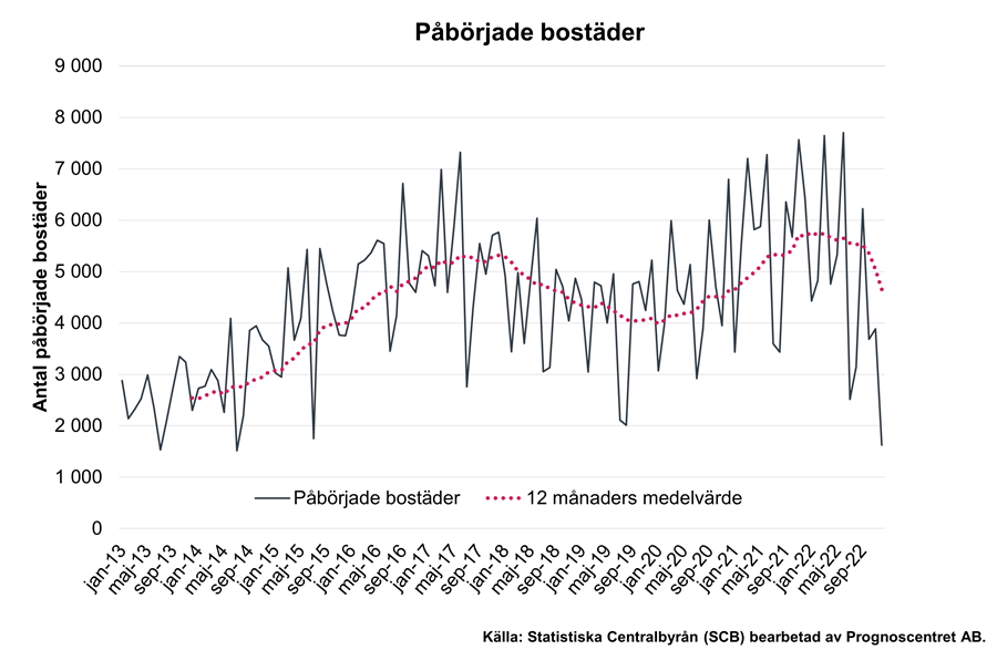 Den senaste tillgängliga påbörjandestatistiken omfattar december 2022 och visar att det under månaden byggstartades drygt 1 600 bostäder i landet. Jämfört med samma månad 2021 är det en nedgång med hela 75 procent eller 4 800 bostäder. På helåret 2022 uppgick antalet byggstartade bostäder till 55 800 bostäder - en minskning med nära en femtedel (-18 procent) jämfört med 2021. Jämfört med 2020 är skillnaden dock inte lika dramatisk utan tangerar då nivån.