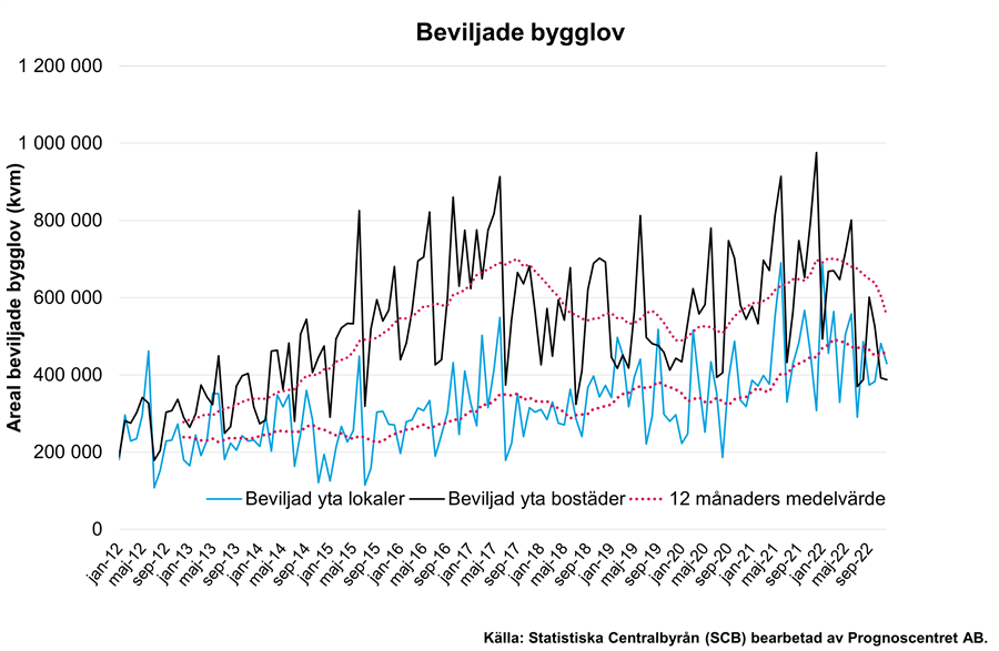 Den totala ytan beviljade lokalbyggnader uppgick i december till cirka 429 000 kvm, en uppgång med 40 procent jämfört med 2021. Under hela 2022 beviljades 5 544 000 kvm lokaler, en uppgång med 4 procent.