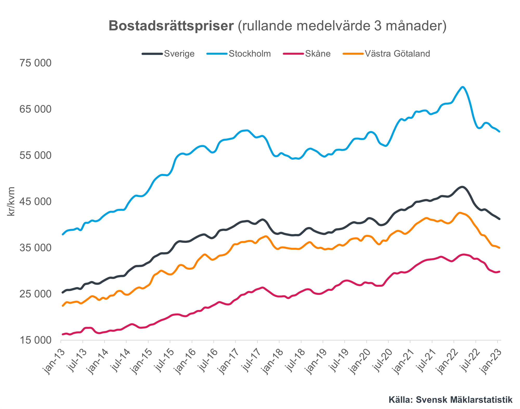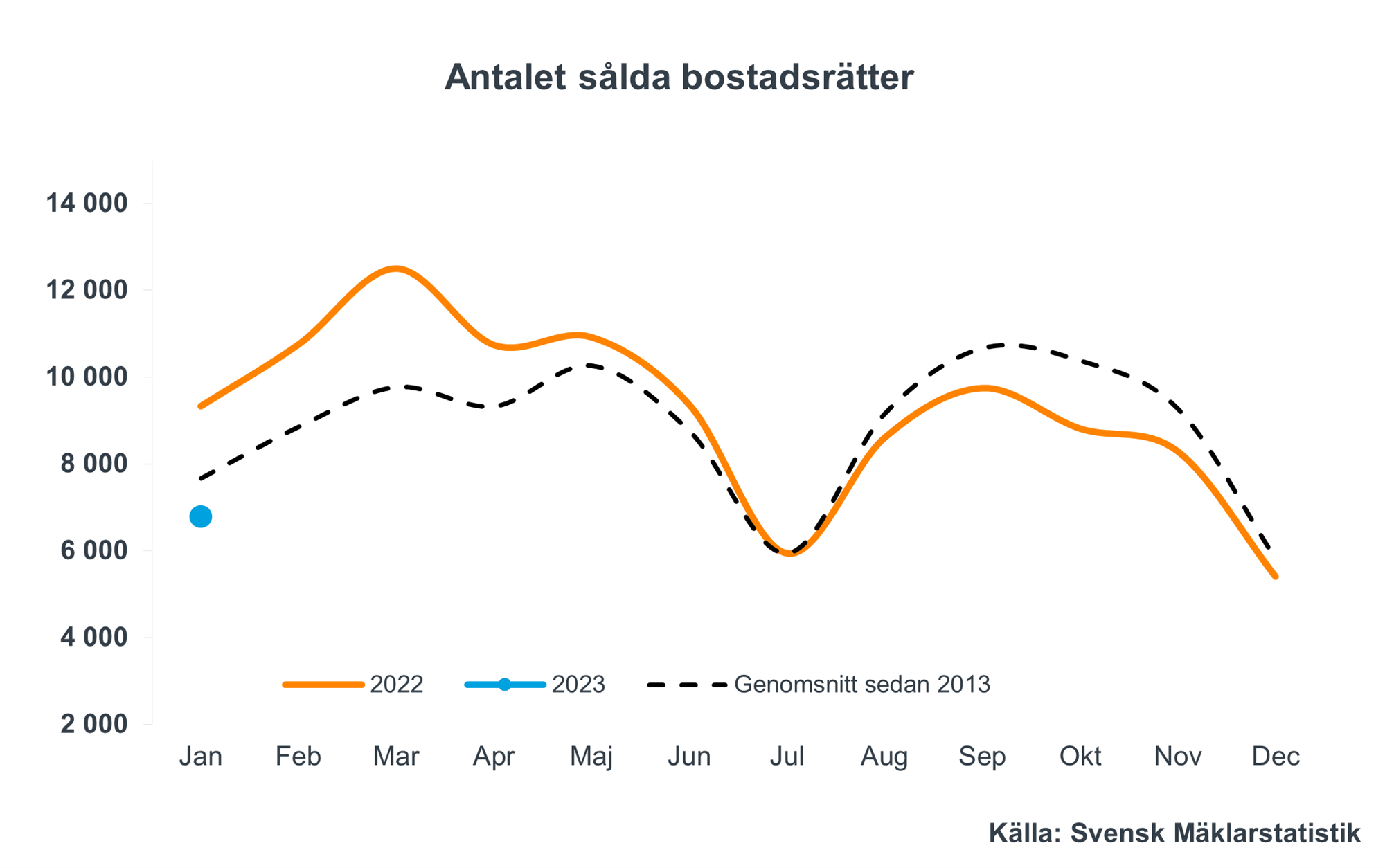 De senaste omsättningssiffrorna omfattar januari 2023 och visar att det såldes cirka 6 800 lägenheter i landet, en minskning med 27 procent jämfört med januari 2022 men en ökning i jämförelse med december på 26 procent. Som historiskt jämförelsetal kan man använda 7 700 - det genomsnittliga antal lägenheter som sålts i januari under det senaste decenniet. För att hamna under januari månads omsättningsnivåer behöver vi dessutom gå tillbaka till 2015.
