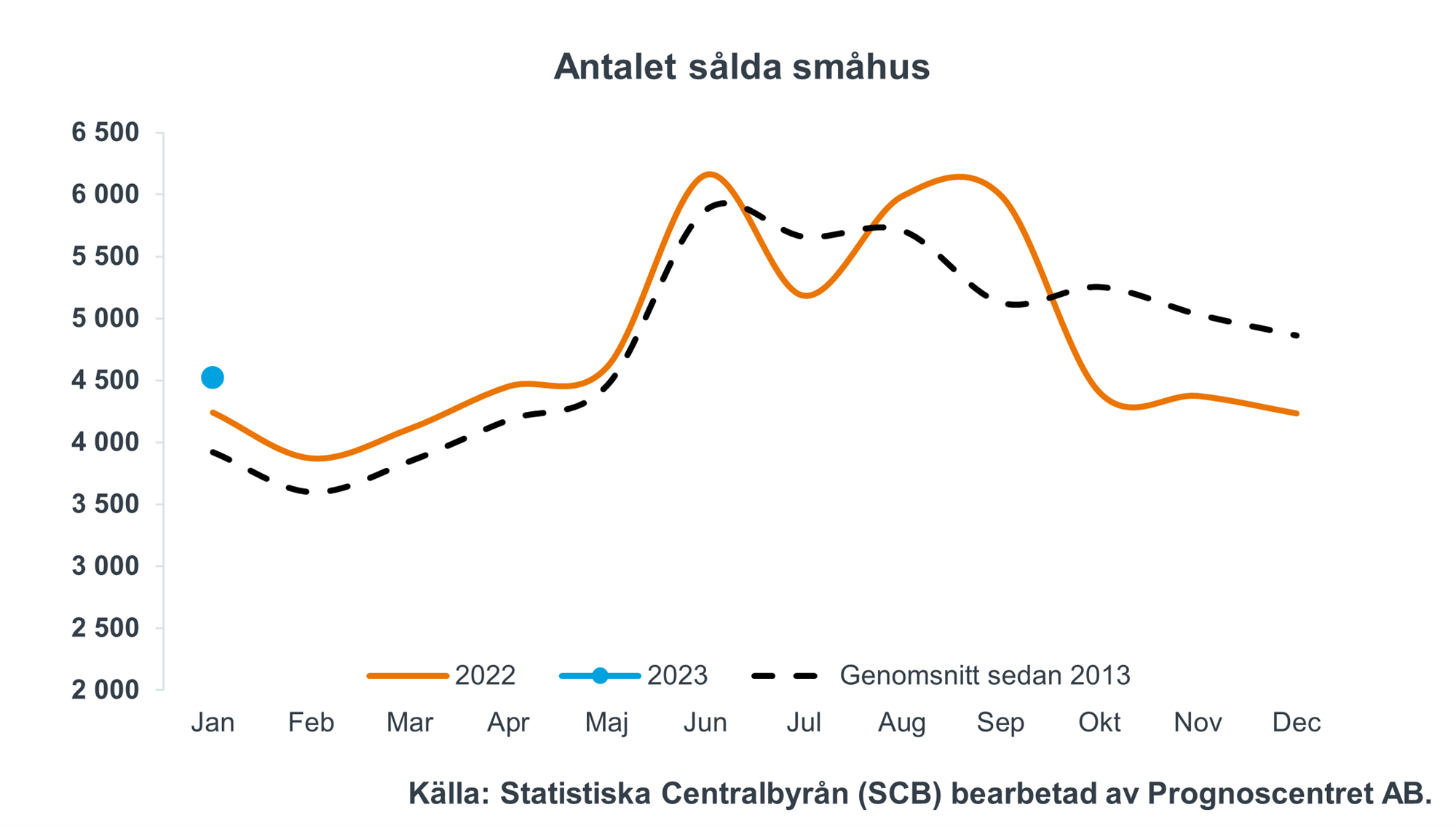 Omsättningen av småhus ökade i januari med 7 procent, både i jämförelse med januari under föregående år men också med månaden innan Totalt uppgick antalet omsatta småhus till cirka 4 500. Det innebär att omsättningen låg högre än den genomsnittliga nivån under det senaste decenniet (3 900).