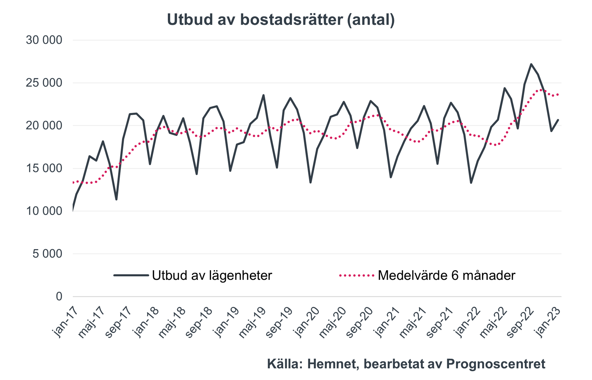 Hemnets utbudsstatistik visar på fortsatt höga nivåer vid – en trend vi sett sedan sommaren 2022. Sedan juni har utbudsförändringen uppgått till tvåsiffriga nivåer (jämfört med samma månader föregående år). I januari låg nära 21 000 bostadsrätter ute till försäljning vilket är 30 procent högre än samma månad 2021. Jämfört december var utbudsökningen 7 procent.