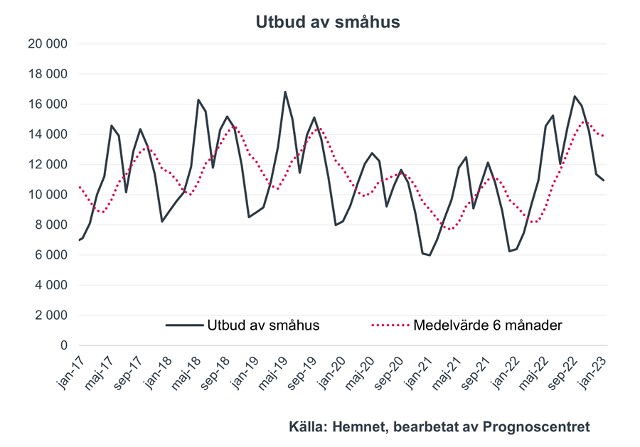 För småhus ökade utbudet desto mer i januari, med 71 procent på 12 månader. Däremot minskade utbudet med 4 procent med december som jämförelsemånad.