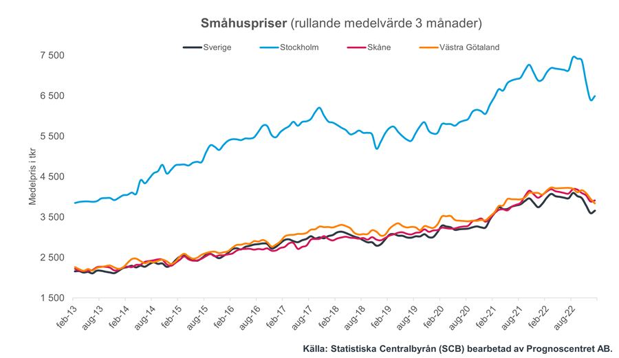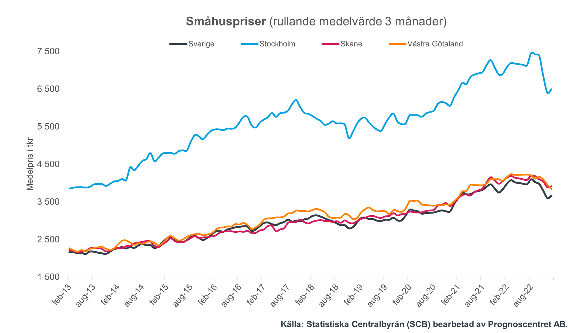 Av de tre storstadsregionerna sjönk priserna under en 12-månadersperiod mest i Västra Götaland (-16,3 procent). I Storstockholm föll priserna med 11,3 och i Skåne med 8,5 procent. Jämfört med december ökade priserna endast i Skåne (0,5 procent) och sjönk i övriga regioner – med 1 procent både i Stockholm och Västra Götaland.