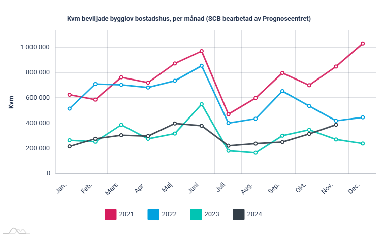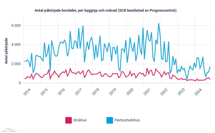 Den senaste byggstatistiken omfattar november och visar att det totala antalet påbörjade bostäder uppgick till cirka 2 150, en ökning med 23 procent jämfört med november 2023. Månadsstatistiken fluktuerar mycket och jämförs jan-nov med motsvarande period 2023 så ökade antalet påbörjade bostäder med 24 procent eller cirka 4 500 stycken.