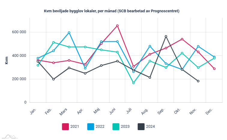 I november beviljades en areal om knappt 184 000 kvadratmeter lokaler, en minskning med 39 procent eller 115 000 kvadratmeter jämfört med november 2023. Under jan-nov uppgick beviljade bygglov till sammanlagt 3 293 000 kvadratmeter, vilket är en minskning med 22 procent jämfört med de cirka 4,2 miljoner kvadratmeter som beviljades under motsvarande period 2023.