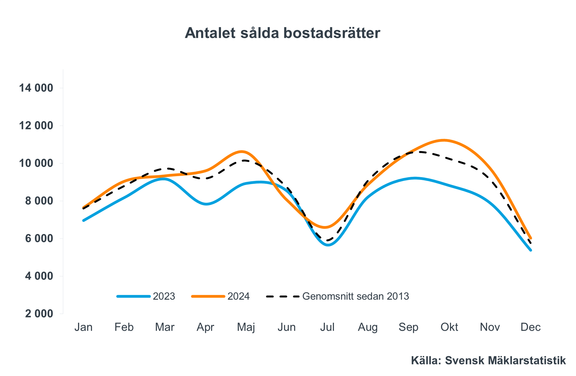 Antalet sålda bostadsrätter i december landade på drygt 6 000, vilket är 12 procent fler än december 2023 men 38 procent färre än i november. Antalet är något fler än den genomsnittliga nivån för månaden sedan 2013 (5 770).