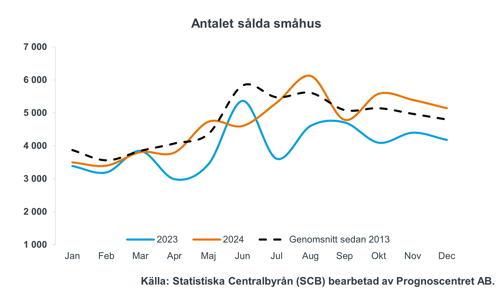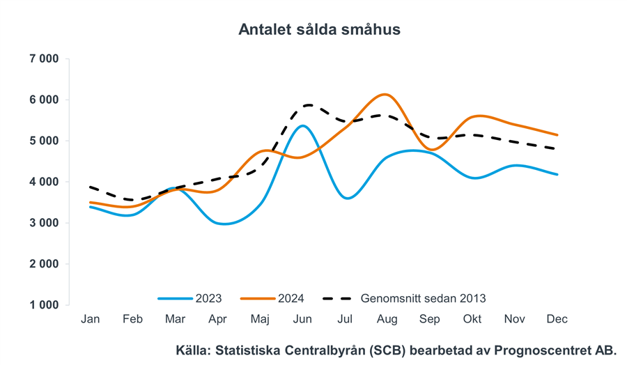 Efter sommaren kan en svagt uppåtgående trend för småhusförsäljningen anas. I augusti, oktober, november och december har också omsättningen av småhus varit högre än normalt. I december såldes drygt 5 100 småhus, en ökning med 23 procent jämfört med 2023. Den genomsnittliga nivån för december sedan 2013 uppgår till 4 800 sålda småhus.