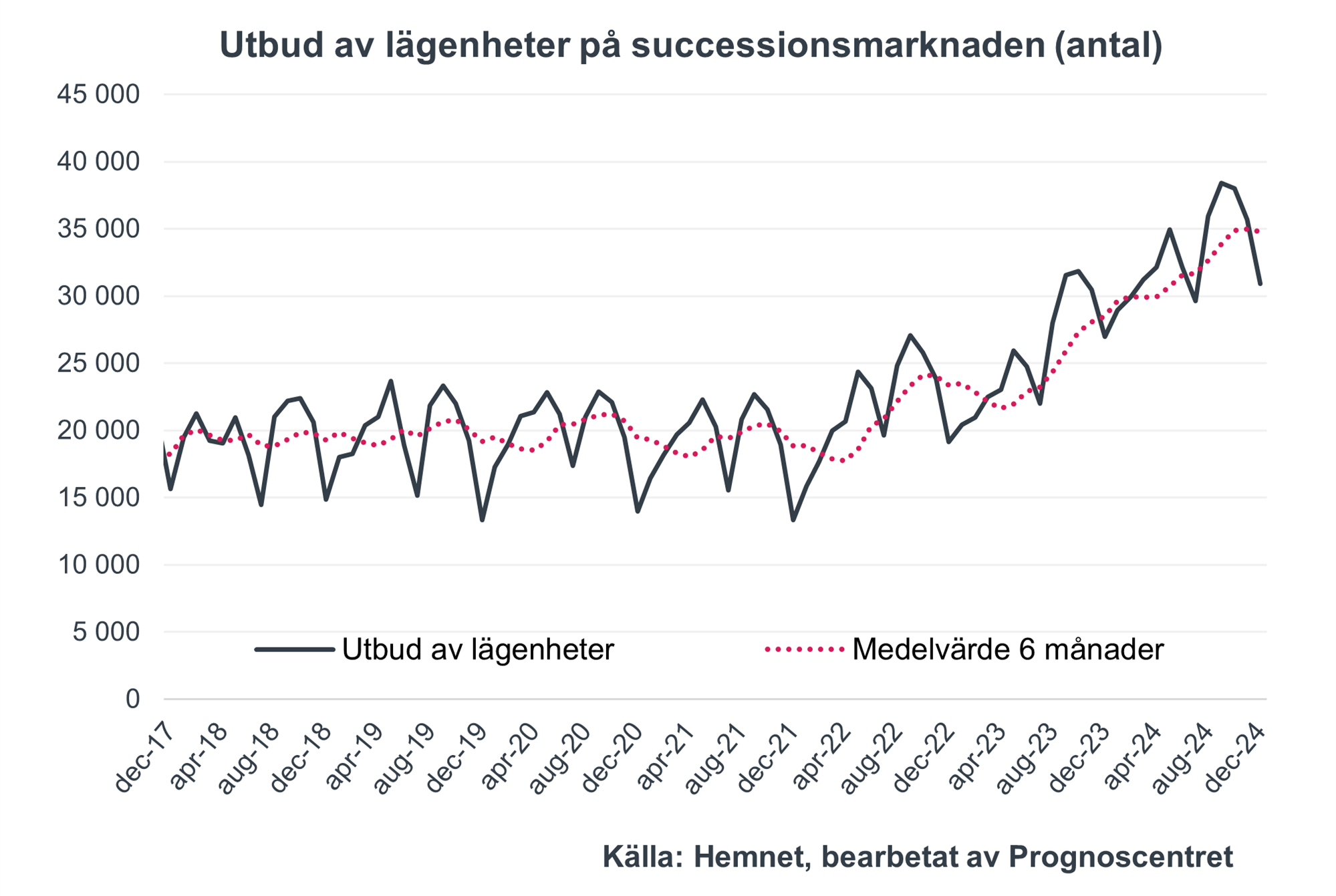 Hemnets statistik för successionsmarknaden vilket inkluderar såväl bostäder till salu samt kommande objekt visar att utbudet av lägenheter i december uppgick till knappt 31 000, vilket är 15 procent högre än året innan men 13 procent lägre jämfört med november.