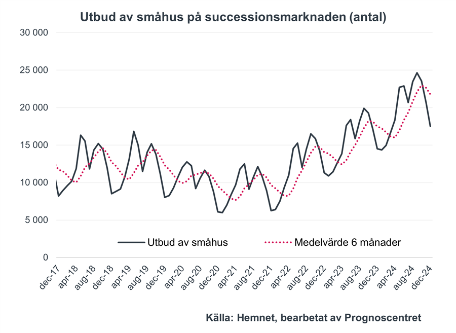 Hemnets utbud av villor uppgick i december till drygt 17 500 vilket är 21 procent högre än 2023 men 15 procent lägre än månaden innan.