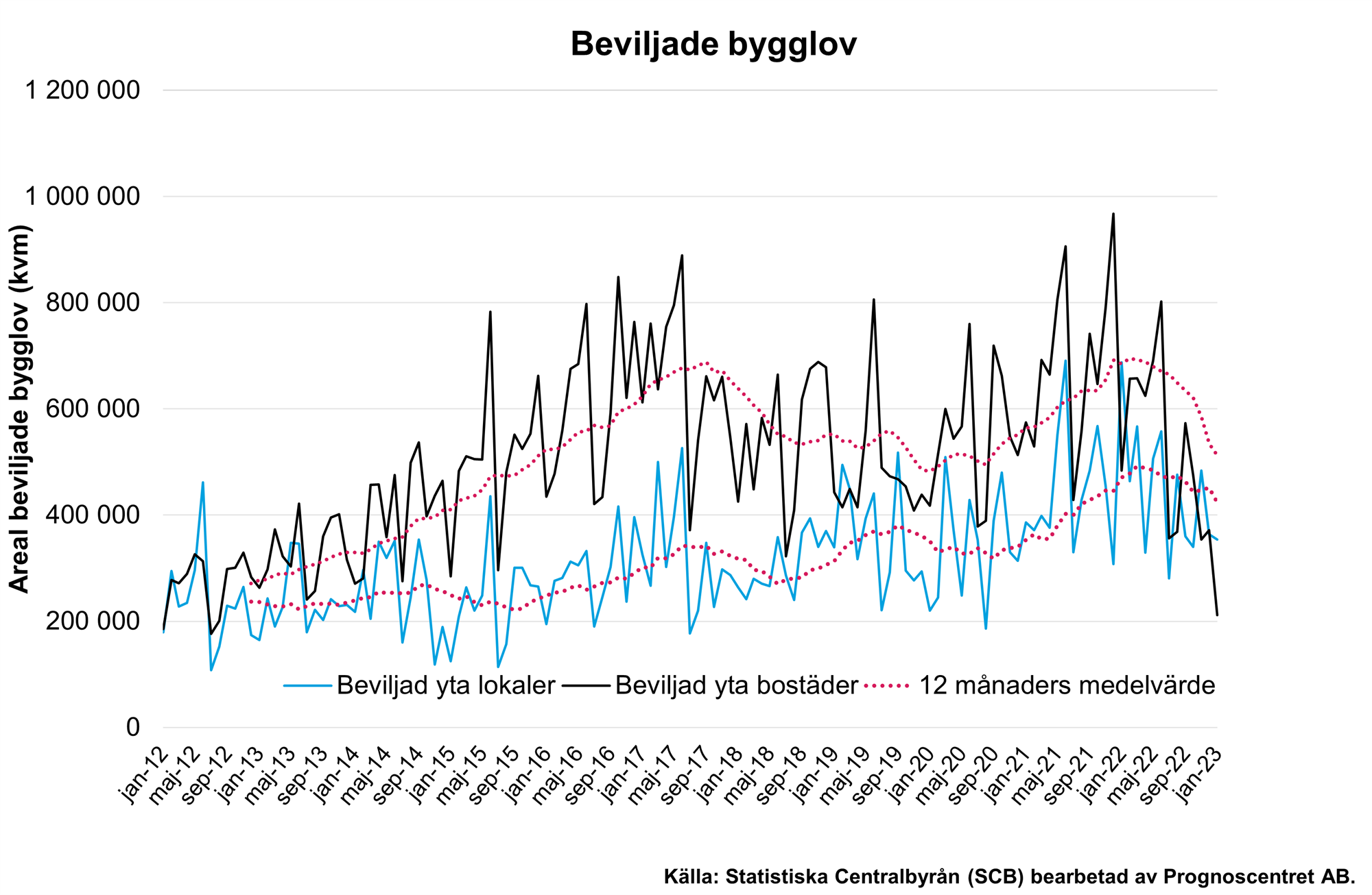 Ytan beviljade bostäder i januari uppgick till cirka 211 600 kvm, en minskning med 56 procent jämfört med januari 2022. Jämfört med januari 2021 är minskningen drygt 63 procent.