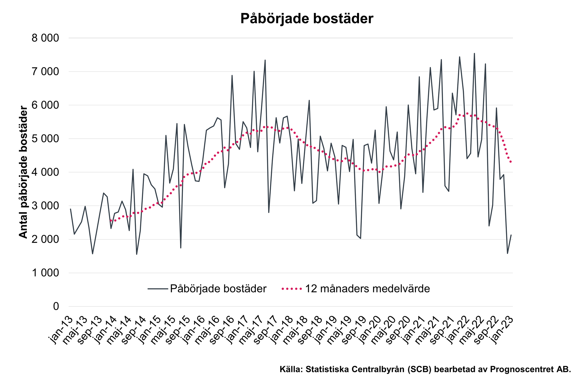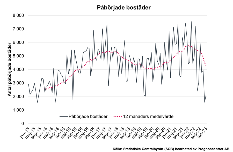 Antalet påbörjade flerbostadshus uppgick under månaden till 1 579, en minskning med 56 procent jämfört med januari 2022. Antalet byggstartade småhus uppgick till 549, en minskning med en tredjedel.