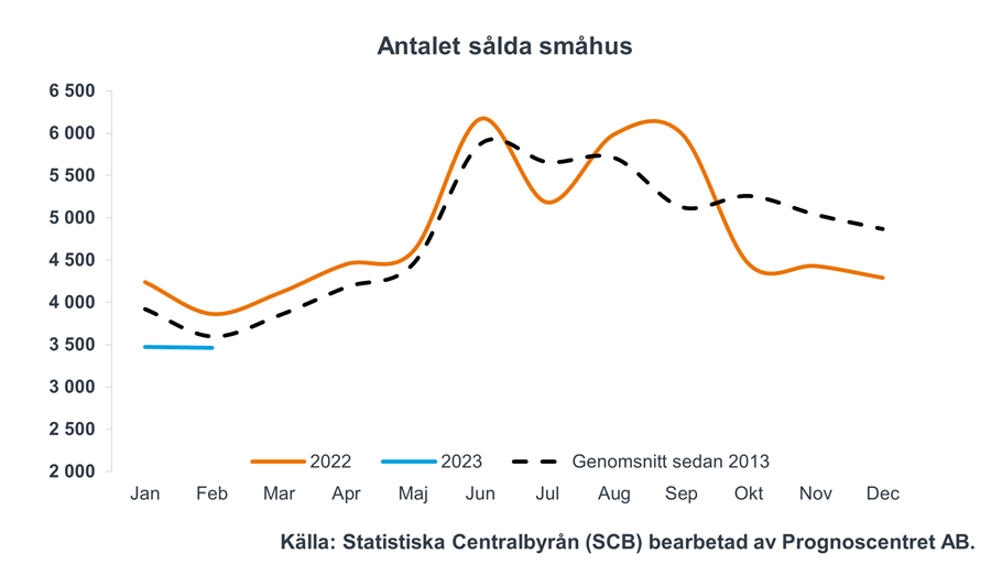 Omsättningsnivån för småhus var i februari oförändrad jämfört med månaden innan. Totalt såldes under månaden nära 3 500 småhus, en minskning med 10 procent jämfört med 2022.