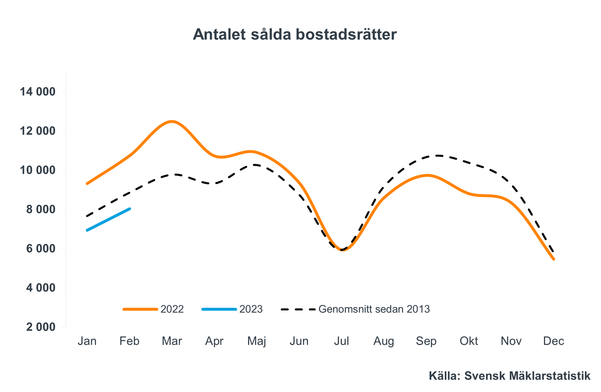 Det historiska genomsnittet för antalet sålda bostadsrätter i februari under den senaste 10-årsperioden är 8 850 bostäder.