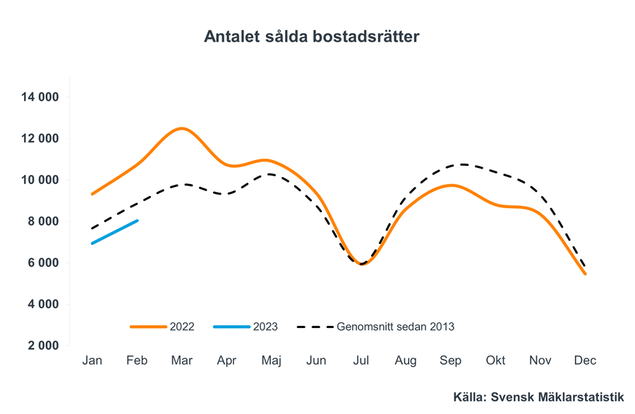 Omsättningsstatistiken för bostäder visar att antalet sålda bostadsrätter i februari uppgick till cirka 8 000, en nedgång med 25 procent jämfört med samma månad 2022. Det är dock en uppgång med 16 procent jämfört med månaden innan.