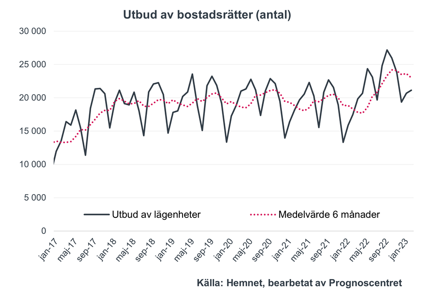 Hemnets utbudsstatistik visar att antalet lägenheter ute till försäljning i februari uppgick till cirka 21 100, vilket är 21 procent högre än februari 2022. Jämfört med månaden innan ökade utbudet med 2 procent.