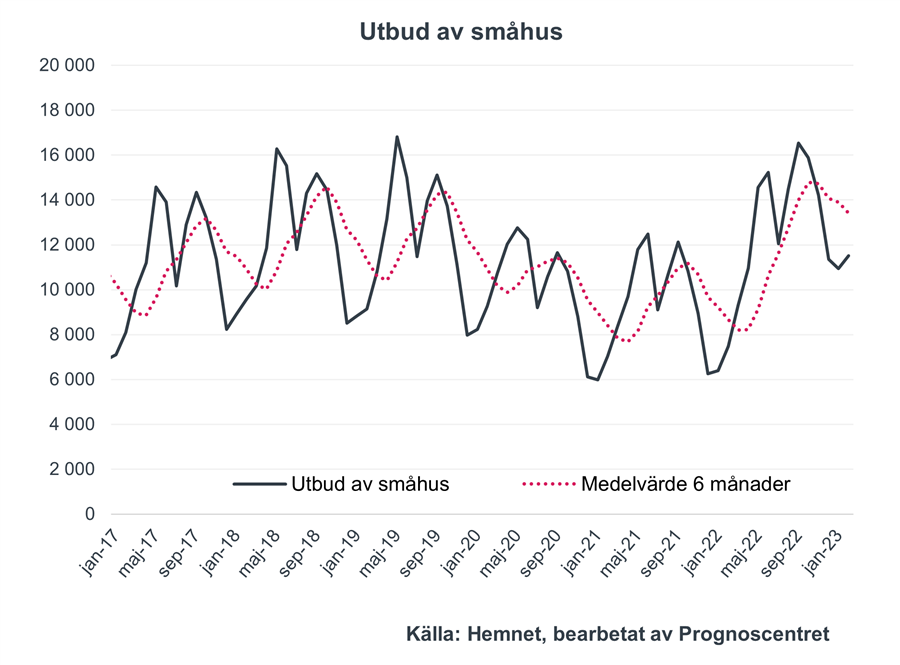 Utbudet av småhus var i februari 54 procent högre än samma månad förra året. Totalt låg 11 500 småhus ute till försäljning, en ökning med 5 procent jämfört med januari.