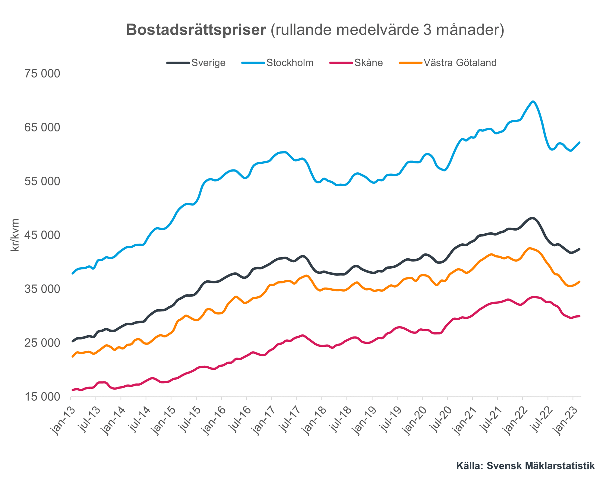 Vid jämförelse mellan februari 2023 och februari 2022 har priserna för bostadsrätter i Sverige minskat med cirka 11,6 procent. Vid jämförelse med januari ökade dock priserna med 1 procent.