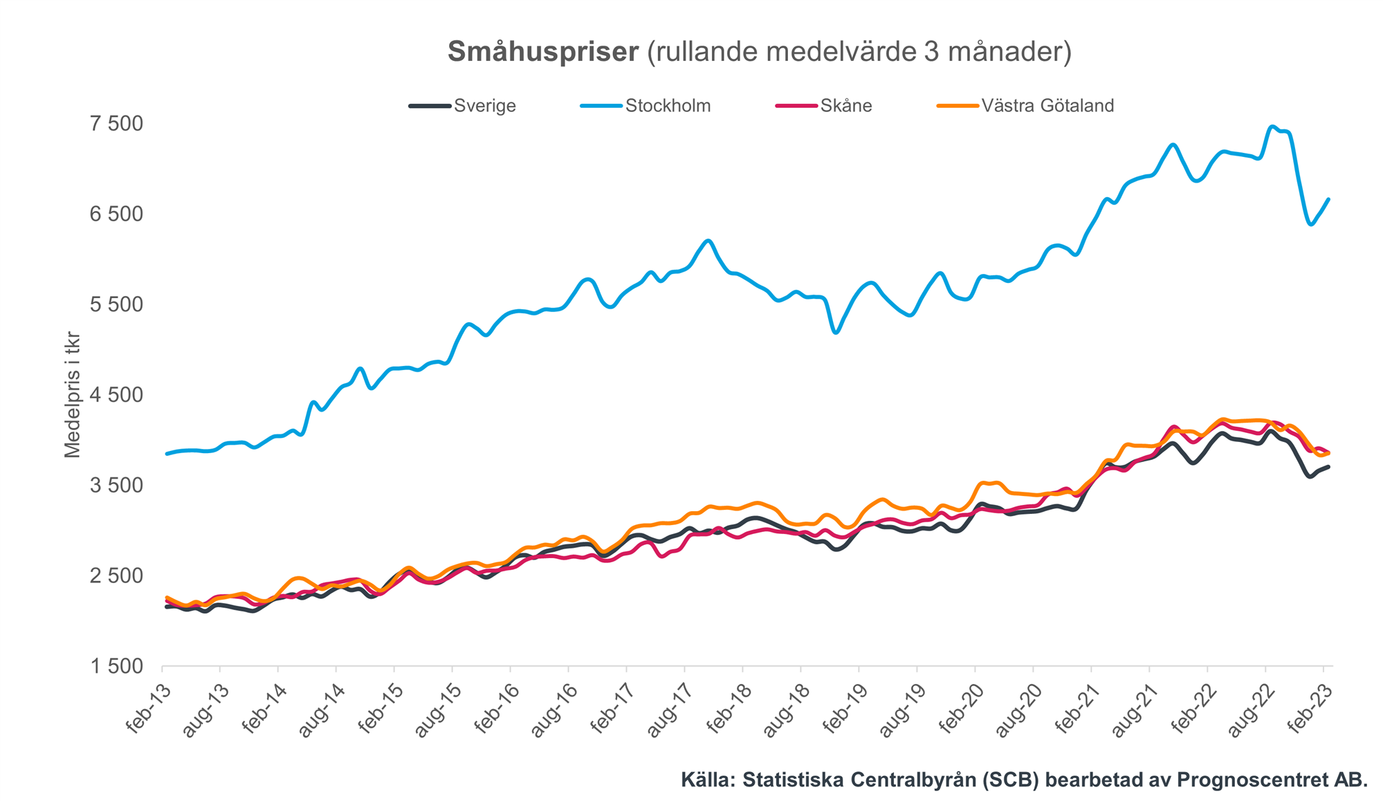 Småhuspriserna sjönk med 7 procent i februari jämfört med samma månad 2022. Jämfört med januari steg priserna något, med omkring 1,2 procent. Den största nedgången jämfört med föregående månad uppmättes för Gotlands län med 4,8 procent och störst uppgång i Jönköpings län med 5,1 procent.