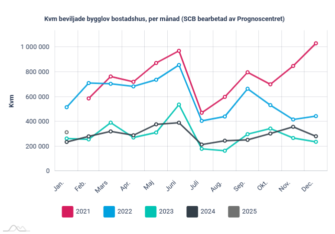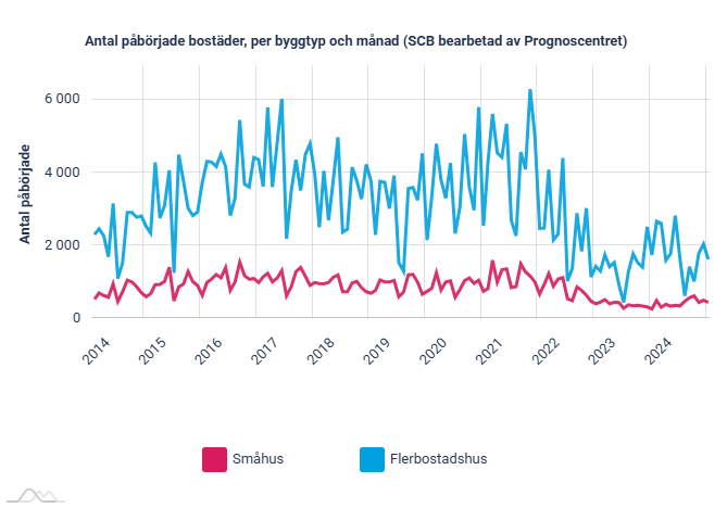 Den senaste byggstatistiken omfattar januari och visar att det totala antalet påbörjade bostäder uppgick till cirka 2 000, en ökning med 3 procent jämfört med januari 2024. Månadsstatistiken fluktuerar mycket men jämförs bostadsbyggandet för de tre senaste månaderna (nov-dec 2024 samt jan 2025) med motsvarande period för ett år sedan (nov-dec 2023 samt jan 2024) så syns en svag ökning av antalet påbörjade bostäder med 4 procent eller cirka 250 stycken.