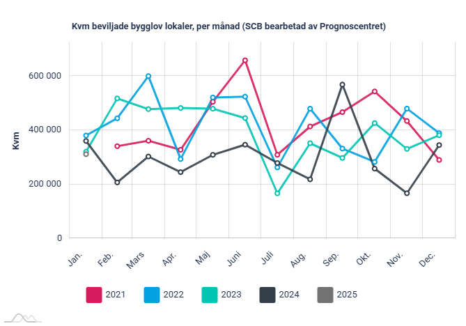 I januari beviljades en areal om drygt 310 000 kvadratmeter lokaler, en minskning med 14 procent eller knappt 49 000 kvadratmeter jämfört med januari ifjol. Under helåret 2024 uppgick beviljade bygglov till knappt 3 599 000 kvadratmeter, vilket är en minskning med 23 procent jämfört med de dryga 4 665 000 kvadratmeter som beviljades under 2023.