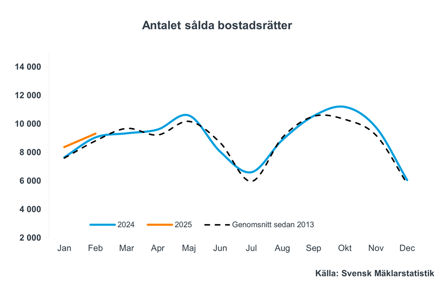 Antalet sålda bostadsrätter i februari 2025 landade på drygt 9 300, vilket är 3 procent fler än februari 2024 och 11 procent fler än föregående månad. Antalet är något fler än den genomsnittliga nivån för månaden sedan 2013 (8 800).