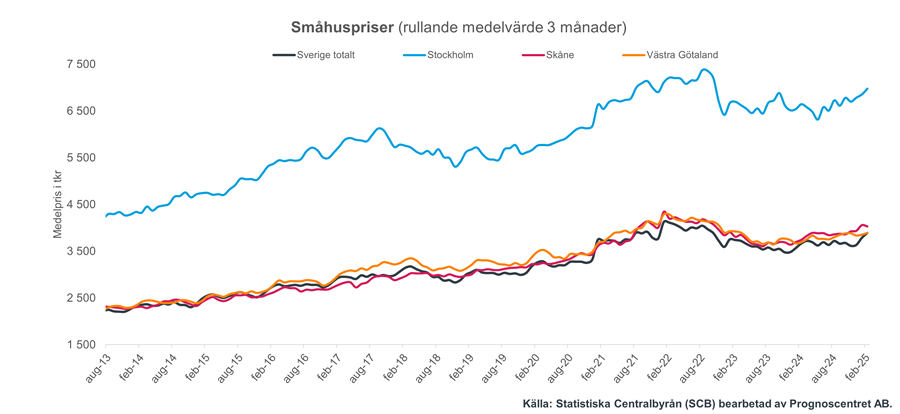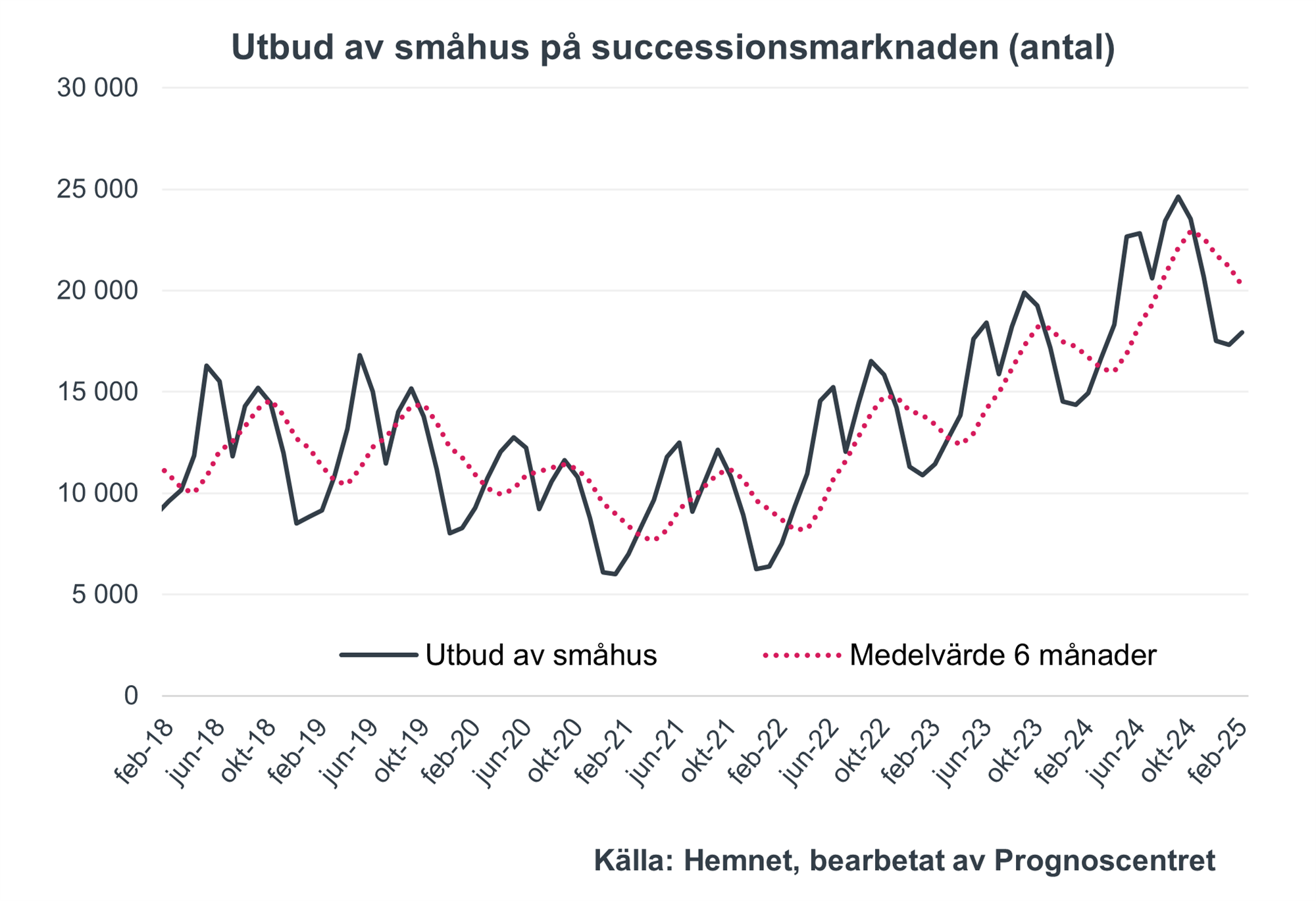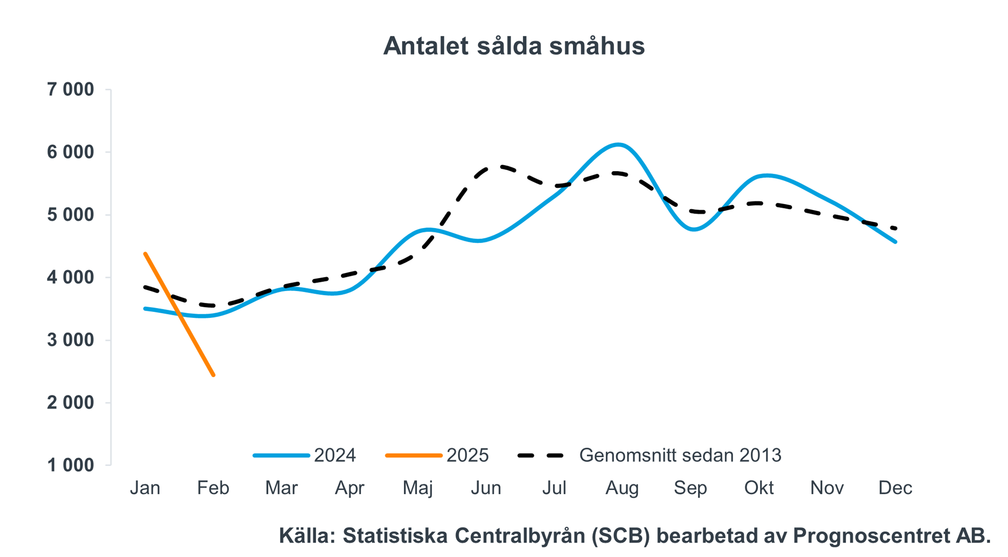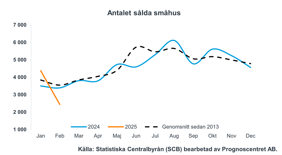 Under februari 2025 såldes cirka 2 500 småhus, en minskning med 30 procent jämfört med februari ifjol. Den genomsnittliga nivån för februari sedan 2013 uppgår till cirka 3 500 sålda småhus. Siffran för februari var ovanligt låg och bedöms mer osäker än vanligt. SCB samlar in månadsdata som är preliminär och behäftad med osäkerhet. Prognoscentret räknar därför upp månadsnoteringarna cirka ett år bakåt för eftersläpning i SCB:s statistik. Nästa månads mätning kommer ge mer klarhet i om SCB:s insamlade värde för februari innebar ett ovanligt stort bortfall.