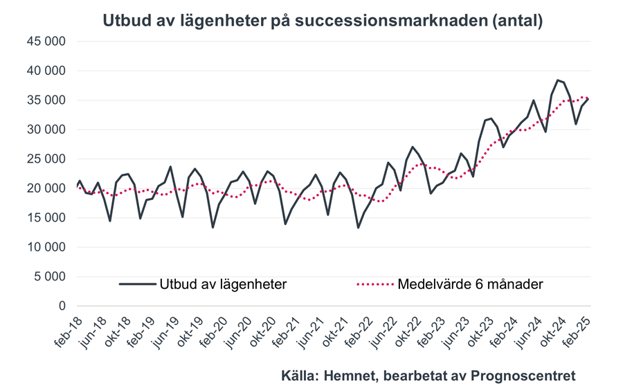 Hemnets statistik för successionsmarknaden vilket inkluderar såväl bostäder till salu samt kommande objekt visar att utbudet av lägenheter i februari uppgick till drygt 35 200, vilket är 18 procent högre än året innan och 4 procent högre jämfört med januari. Ända sedan sommaren 2022 har utbudet varit högre än det historiska genomsnittet och denna trend accelererade under hösten 2023. Under början av 2025 har det ovanligt höga utbudit vuxit än mer.