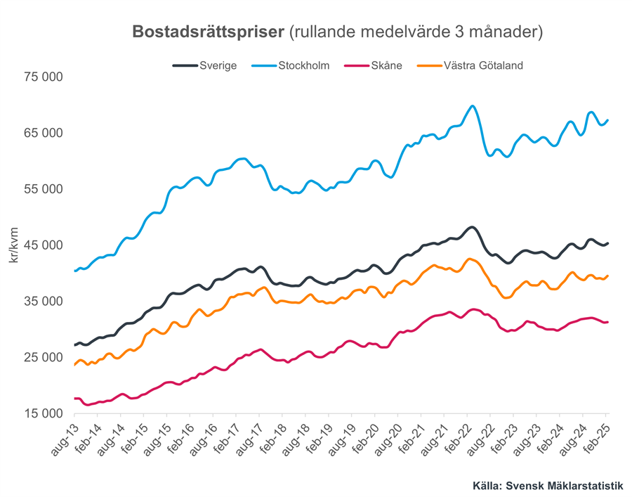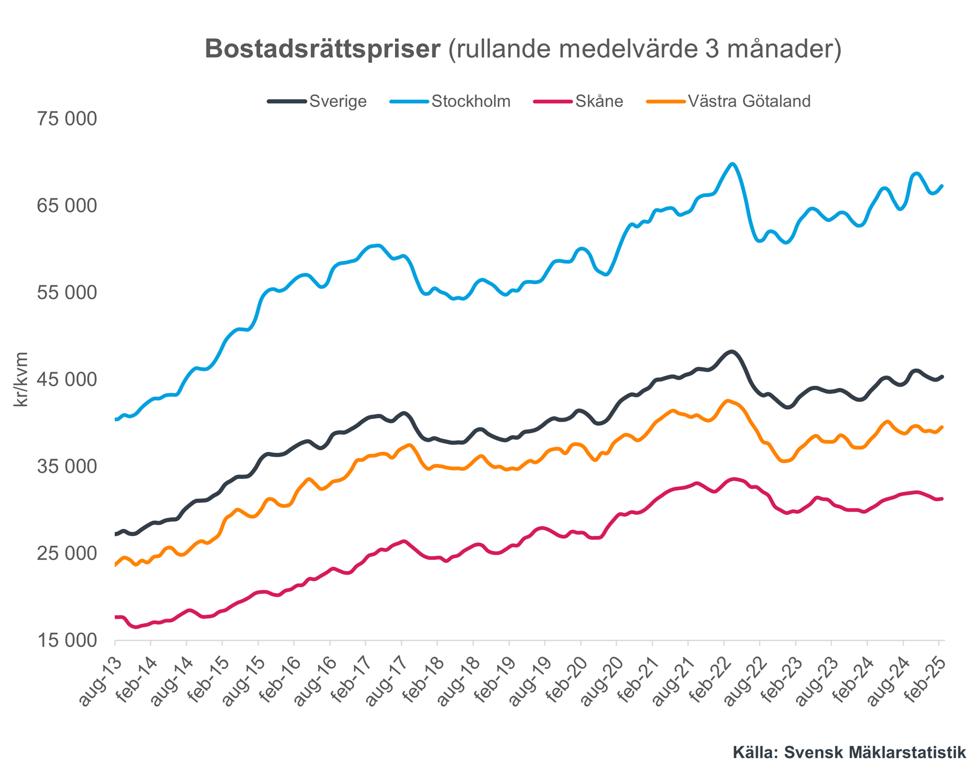 Priset per kvadratmeter på bostadsrätter i hela landet steg med 0,8 procent i februari jämfört med månaden innan och steg med 3,8 procent jämfört med februari 2024.