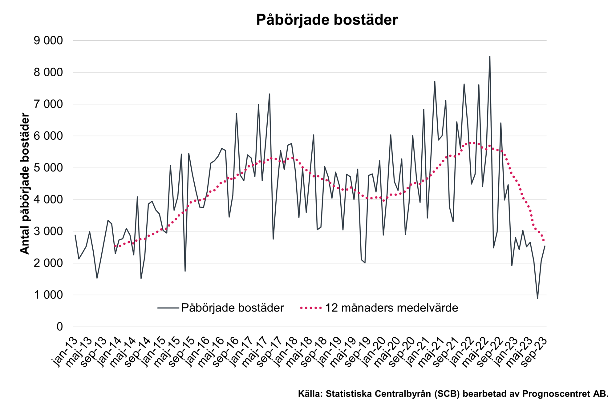 I september uppgick antalet påbörjade bostäder till 2 540, en nedgång med 60 procent jämfört med samma period 2022. Det totala antalet påbörjade bostäder per september i år ligger på nästan 21 000, vilket är en nedgång med 55 procent mot föregående års siffra på 47 100.