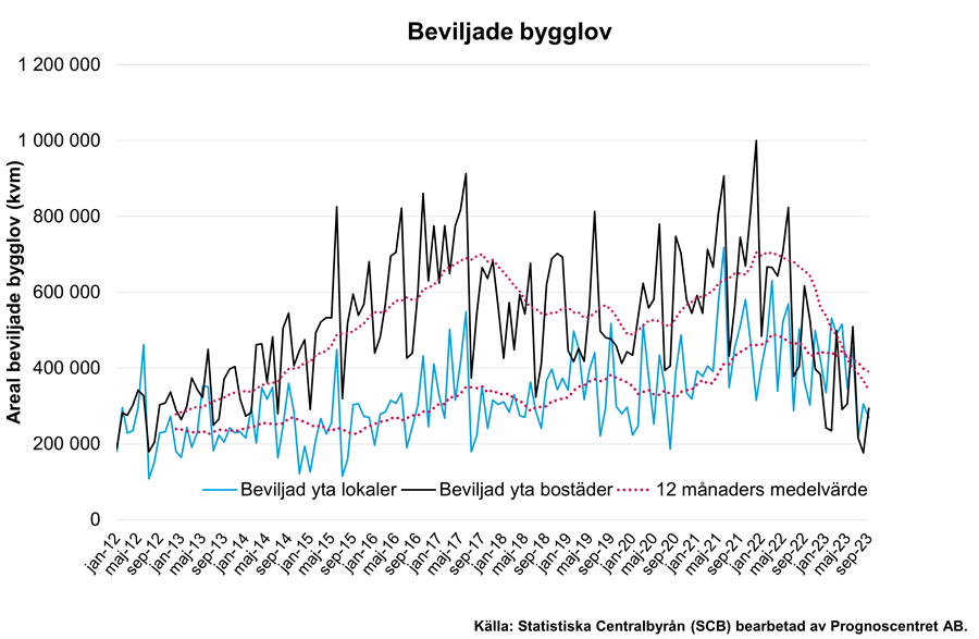 Avseende beviljade bygglov för bostäder under september månad så sjönk de med 52 procent jämfört med 2022. Totalt beviljades under månaden bostäder motsvarande en yta om cirka 294 000 kvm. Från januari till september beviljades totalt 2 767 000 kvm, en nedgång med 49 procent, jämfört med samma period i fjol.