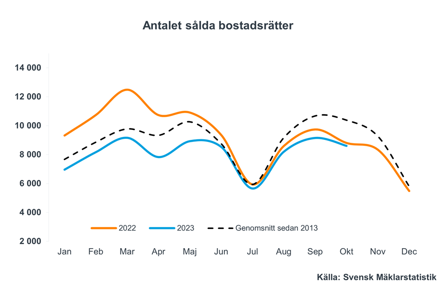 Lägenhetsförsäljningarna uppgick i oktober till 8 600, vilket var 6 procent färre jämfört med i september och 2 procent färre jämfört med samma månad i fjol. Det historiska genomsnittet för månaden (sedan 2013) ligger på 10 400 omsatta lägenheter.