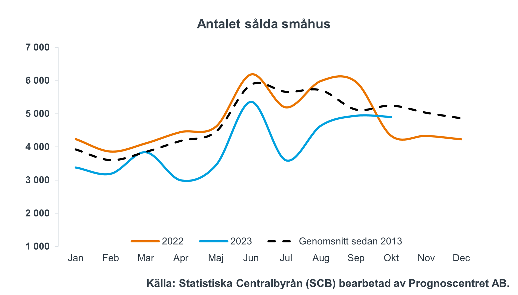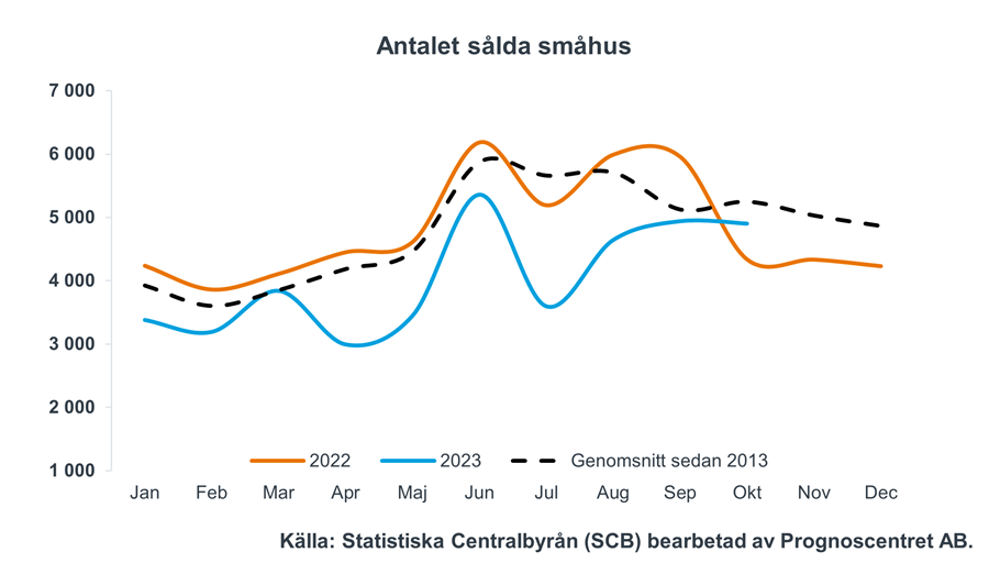 Omsättningen av småhus minskade marginellt under månaden, ned en 1 procent under oktober månad jämfört med september, till 4 900. Jämfört med i fjol omsattes 13 procent fler småhus. Det historiska genomsnittet för månaden sedan 2013 ligger på 5 250.