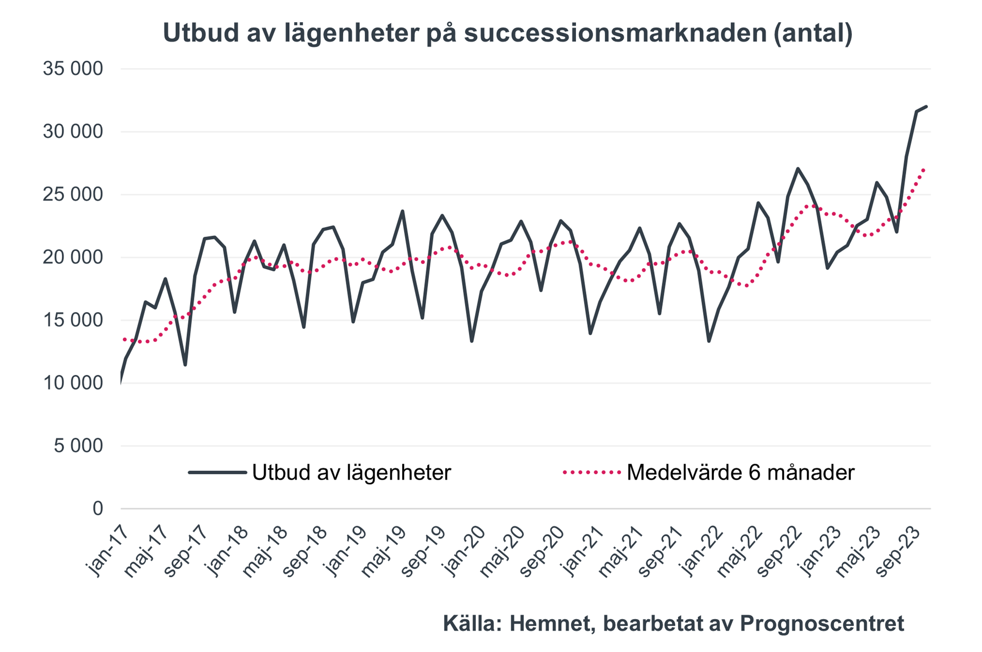 Hemnets senaste statistik för successionsmarknaden avseende oktober, vilket inkluderar såväl bostäder till salu samt kommande objekt, visar att lägenhetsutbudet uppgick till cirka 32 000, vilket är en marginell uppgång med 1 procent jämfört med månaden innan. Jämfört med i fjol ligger utbudet 24 procent högre.